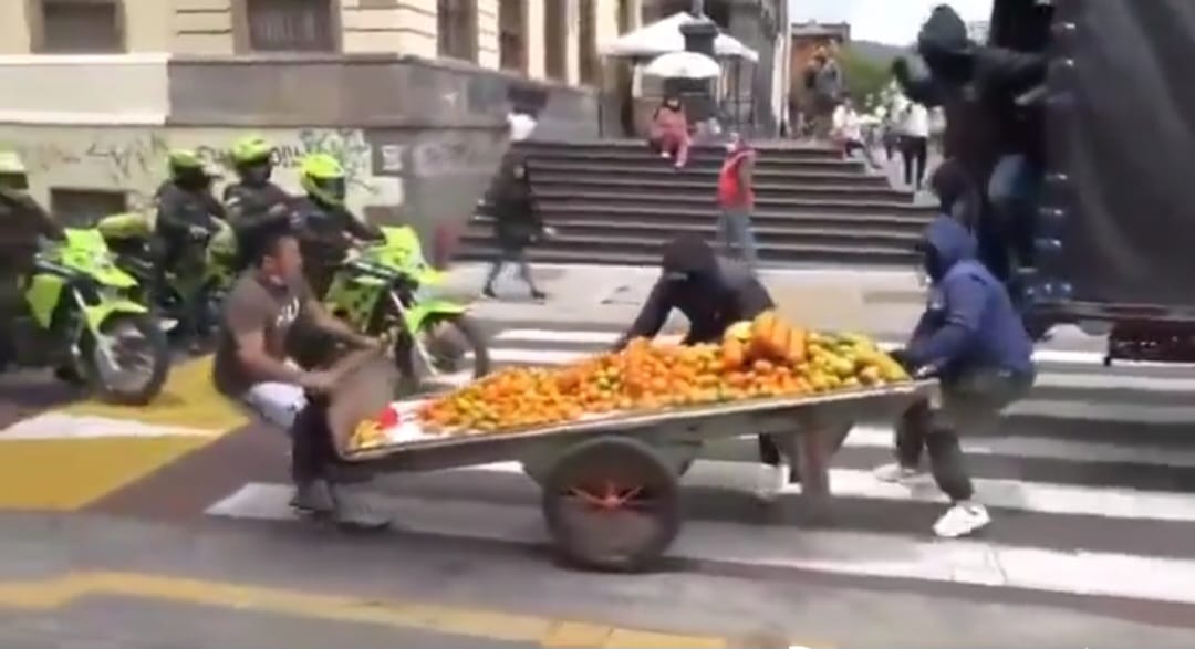 A través de un vídeo que ya circula en redes sociales, se evidencia cómo varios funcionarios de espacio público, que se encontraban con sus rostros cubiertos, intentaron detener a un vendedor ambulante, quien con cuchillo en mano defendió su carreta. Aunque la carreta???????? pic.twitter.com/nLz5YIX7CA