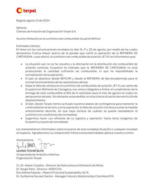 La ministra de Transporte, María Constanza García, reconoció que las tarifas de los tiquetes aéreos aumentarán debido a la importación de 100.000 barriles de combustible para la industria aeronáutica.