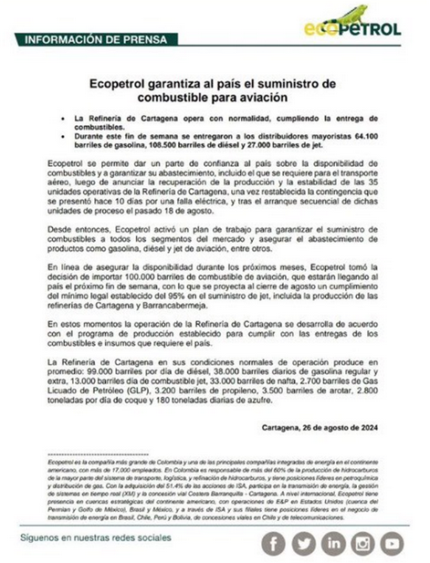 Ecopetrol manifestó en las últimas horas que «la refinería de Cartagena opera con normalidad, cumpliendo la entrega de combustibles».