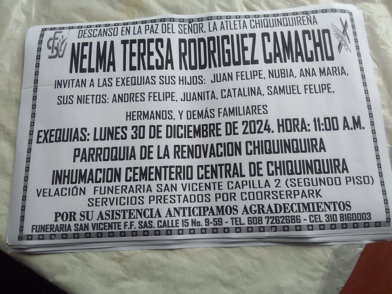 El pasado 27 de octubre falleció en Tunja la destacada deportista chiquinquireña Nelma Teresa Rodríguez Camacho a causa de cáncer.