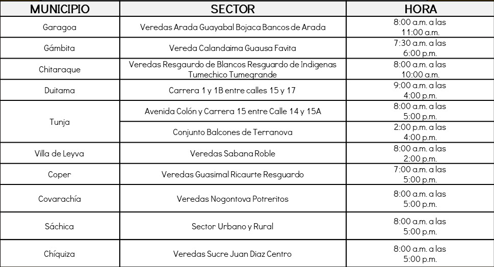 La Empresa de Energía de Boyacá -EBSA- informó que 10 municipios boyacenses presentarán cortes de luz este martes. En este comunicado, se señala que Garagoa, Gámbita, Chitaraque, Duitama, Tunja, Villa de Leyva, Coper, Covarachía, Sáchica y Chíquiza presentarán estas interrupciones de energía.