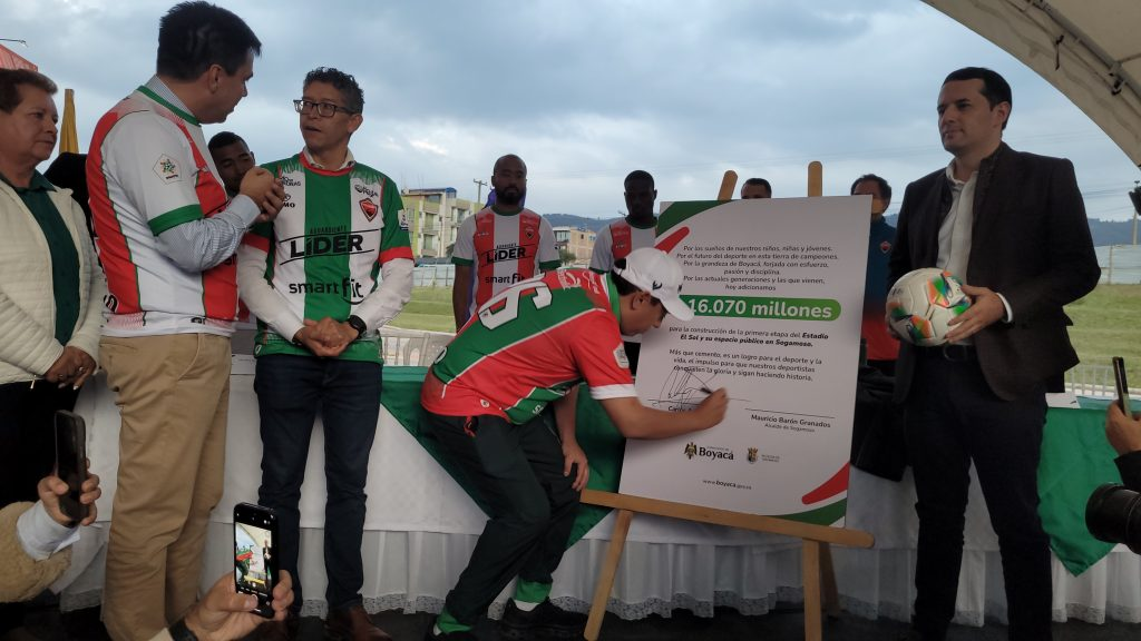El gobernador de Boyacá, Carlos Amaya, y el alcalde de Sogamoso, Mauricio Barón, firmaron un convenio por $16.000 millones adicionales para finalizar las obras del estadio El Sol de Sogamoso, elevando la inversión total a más de $60.000 millones.