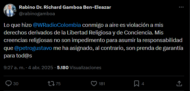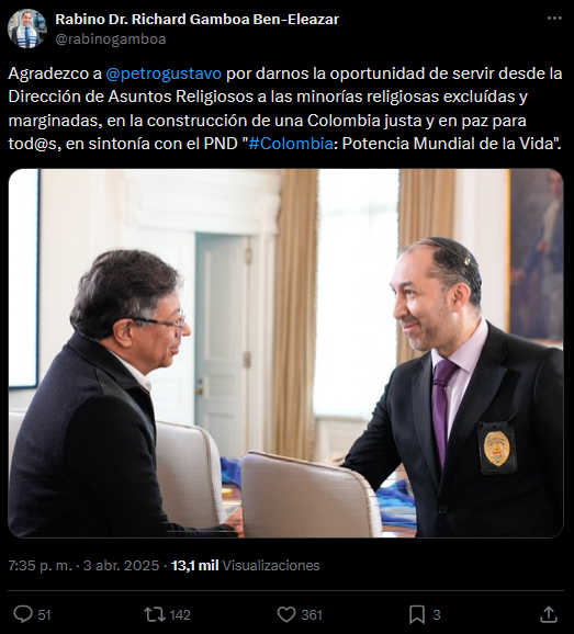En la noche de este jueves, el rabino Richard Gamboa Ben-Eleazar agradeció al presidente Gustavo Petro por su nombramiento como director de Asuntos Religiosos del Ministerio del Interior.