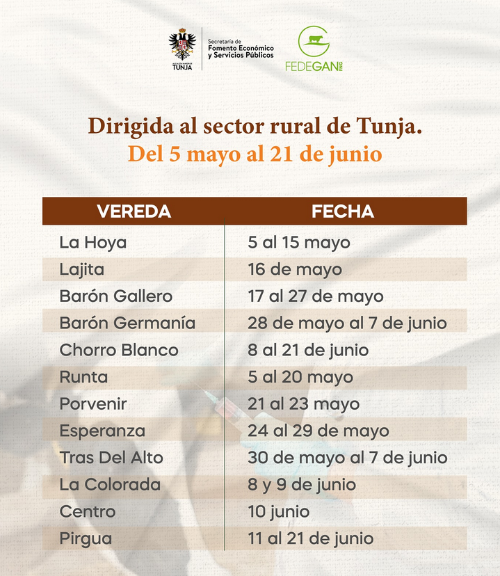Se llevará a cabo, a partir de este lunes, el primer ciclo de vacunación contra fiebre aftosa y brucelosis bovina en Tunja, en una campaña organizada por la Secretaría de Fomento Económico y Servicios Públicos y la Federación de Ganaderos (Fedegán).