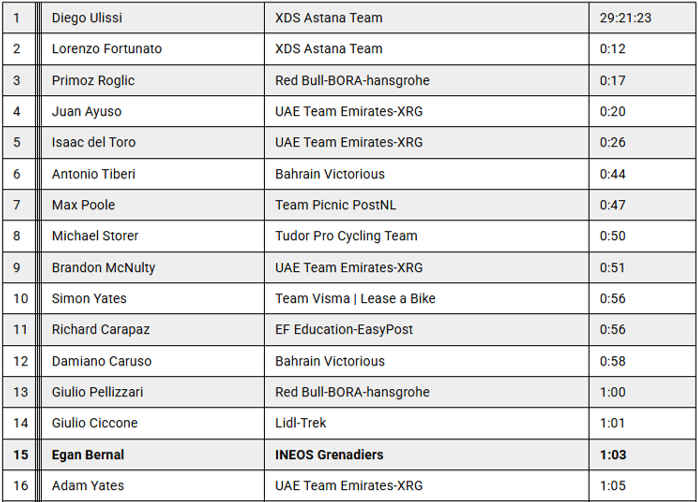 El australiano Luke Plapp llegó a la meta en solitario, obteniendo la victoria. Los favoritos a la clasificación general llegaron a 4'50'', excepto Juan Ayuso, quien cruzó la línea de meta a 4'49'' después de un sprint en los metros finales, ganando un segundo sobre los demás candidatos. Con esto, la diferencia entre Ayuso y Roglic se reduce de cuatro a tres segundos.