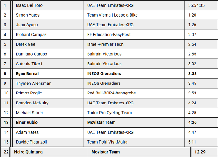 En la parte final, Verona se impuso con 22 segundos de ventaja, seguido en el podio por Florian Stork y Christian Scaroni. En la clasificación general, Primoz Roglic perdió tiempo respecto a los favoritos, mientras que el grupo principal llegó 29 segundos después del ganador. El sprint del grupo lo ganó Filippo Fiorelli, con Einer Rubio siendo el mejor colombiano en 11º lugar.