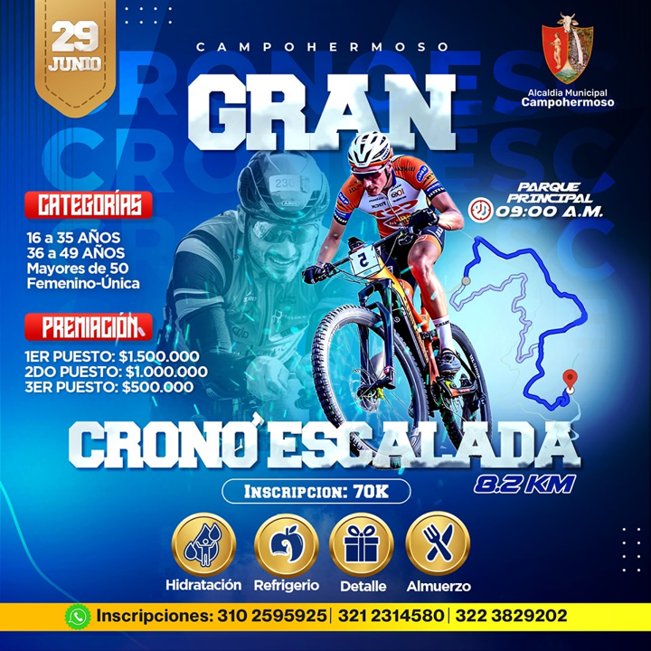En Campohermoso (Boyacá), se realizará el 29 de junio de 2025, la Gran Cronoescalada organizada por la Alcaldía Municipal. El evento deportivo para todos los amantes del ciclismo en la región, tiene una premiación en efectivo.
