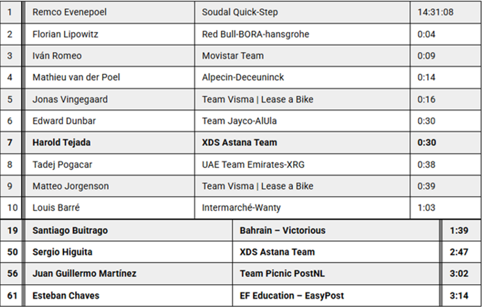 El mejor colombiano en la contrarreloj individual fue Harold Tejada (XDS Astana Team), quien finalizó en el puesto 16 a 1'29'' de la cabeza. En la clasificación general, ocupa el séptimo lugar, a 30'' de Remco Evenepoel.