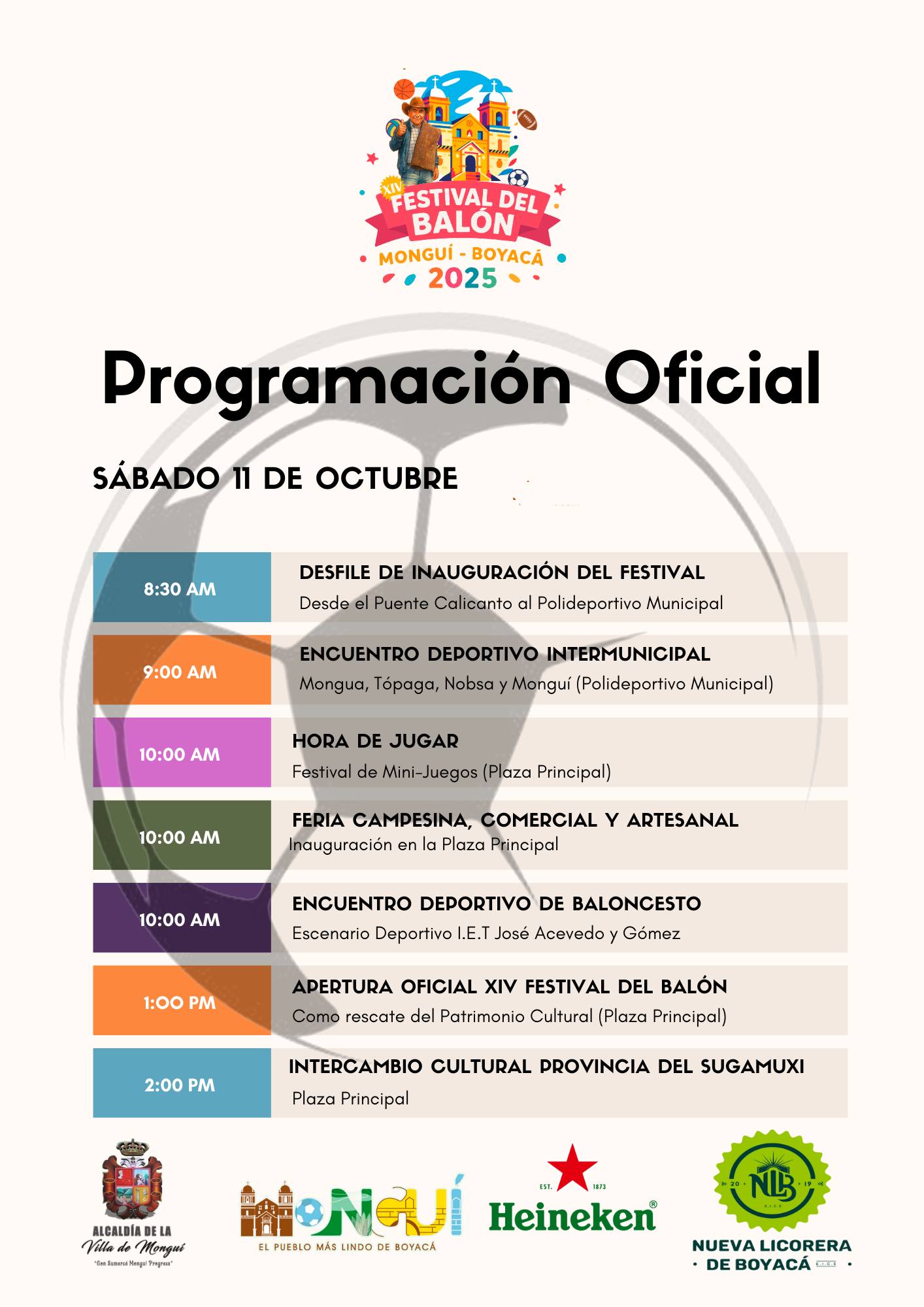 Desde el sábado 11 al lunes 13 de octubre de 2025, Con orgullo y tradición, el municipio de Monguí dará inicio al XIV Festival del Balón, un homenaje al símbolo que por más de nueve décadas ha dado identidad y reconocimiento a nuestra tierra: la esférica, orgullo de los baloneros monguiseños.