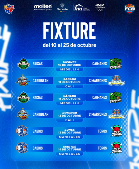 Los partidos se disputarán en los coliseos de Cali, Quibdó, Medellín, Cúcuta, Manizales y Villavicencio.