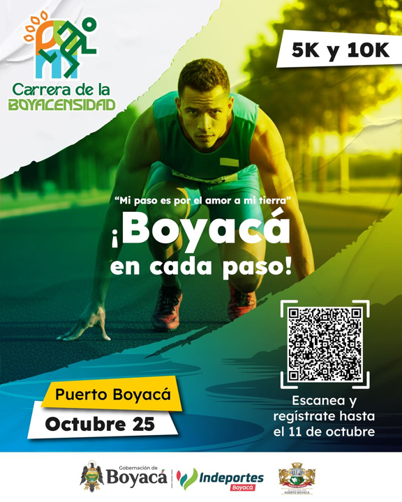 El próximo sábado 25 de octubre, Puerto Boyacá será el epicentro del deporte y el orgullo regional con la primera edición de la Carrera Atlética de la Boyacensidad, un evento que celebra nuestra identidad, el amor por la tierra y la fuerza de su gente.