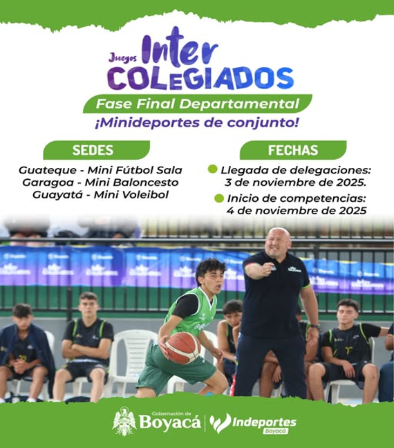 Faltan pocos días para que comiencen las competencias de mini-deportes de los Juegos Intercolegiados 2025, los días 3 y 4 de noviembre. Este evento reunirá a cientos de estudiantes de varios municipios de Boyacá, con Guateque, Garagoa y Guayatá como sedes para mini-fútbol sala, mini-baloncesto y mini-voleibol, respectivamente.
