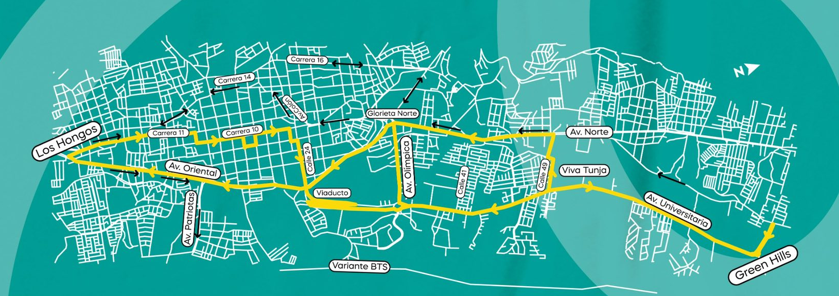 Plaza de Bolívar – carrera 10 – calle 23 – carrera 9 – calle 24 – viaducto – Av. Universitaria (calzada occidental) – calle 22 – Av. Universitaria (calzada oriental) – glorieta del Gobernador – Av. Universitaria (calzada oriental) – retorno calle 41 – Av. Universitaria (calzada occidental) – glorieta del Gobernador – Av. Olímpica (calzada sur) – glorieta norte – Av. Olímpica (calzada norte) – glorieta del Gobernador – Av. Universitaria (calzada occidental) – glorieta Green Hills – Av. Universitaria (calzada occidental) – calle 49 – Av. Norte – glorieta norte – Av. Oriental (calzada occidental) – Los Hongos – carrera 11 (calzada oriental) – calle 15 – carrera 10 – calle 19 – Plaza de Bolívar.