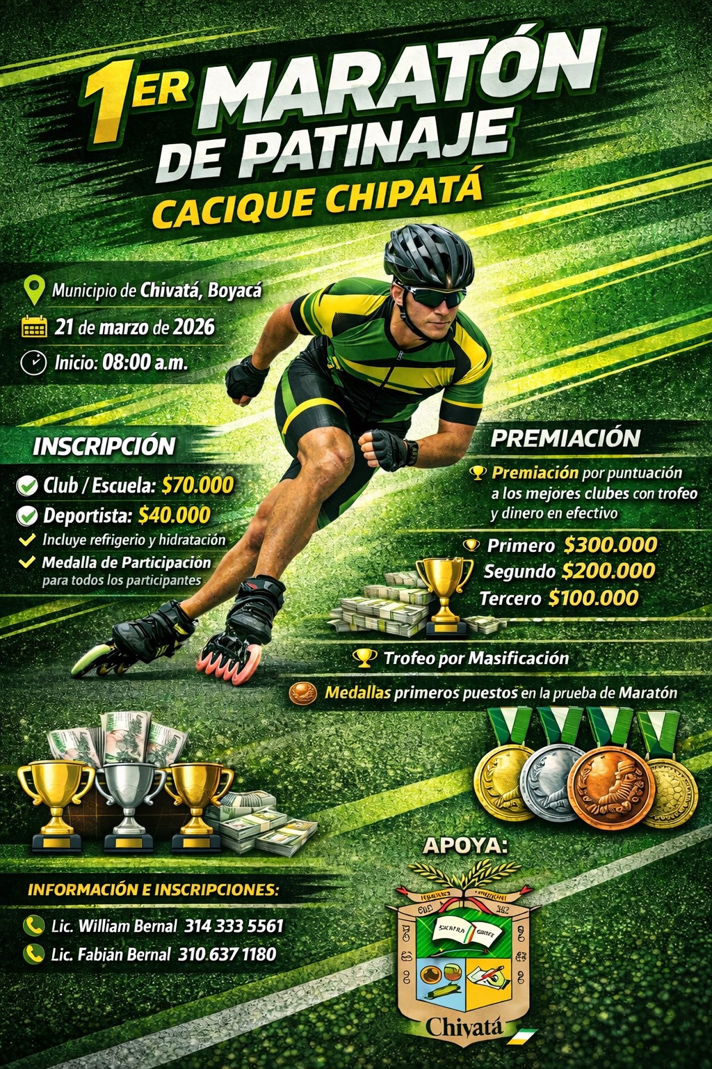 Como parte del proceso de aprendizaje y competencia que se ha venido realizando en la localidad de la provincia de Centro, el municipio de Chivatá será sede de la Primera Maratón de Patinaje Cacique Chipatá, que se escenificará el próximo 21 de marzo.