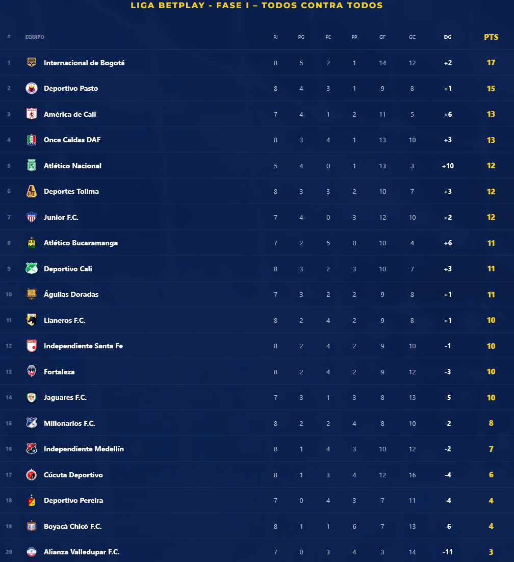 Por detrás de Inter Bogotá, y completando el grupo de los ocho, se ubican Pasto con 15 unidades; América con 13 (+6); Once Caldas con 13 (+3); Nacional con 12 (+10); Tolima con 12 (+3); Junior con 12 (+2); y Bucaramanga con 11 (+6).