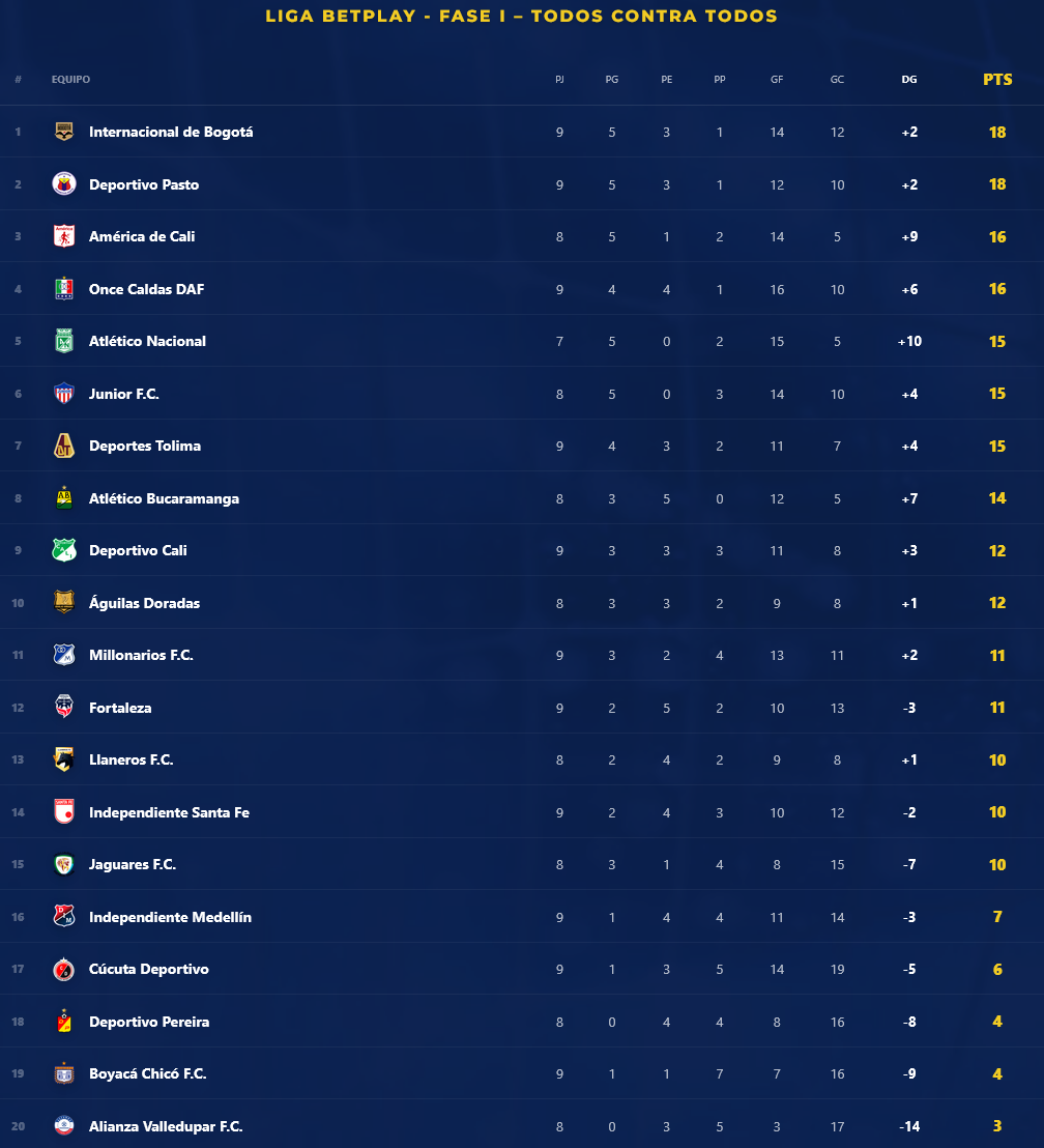Pese al empate, Inter de Bogotá se mantiene como líder con 18 puntos y una diferencia de gol de +2. Lo escolta Pasto con el mismo puntaje. Luego aparecen América (16, +9), Once Caldas (16, +6), Nacional (15, +10), Junior (15, +4), Tolima (15, +4) y Bucaramanga, que cierra el grupo de los ocho con 14 unidades.