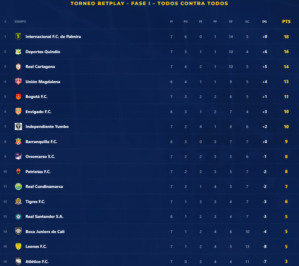 Internacional de Palmira lidera con 18 puntos; le siguen Deportes Quindío con 16; Real Cartagena con 14; Unión Magdalena con 13; Bogotá FC con 11; Envigado FC con 10 y una diferencia de gol de +3; Independiente Yumbo con 10 y +2; y Barranquilla FC con 9.