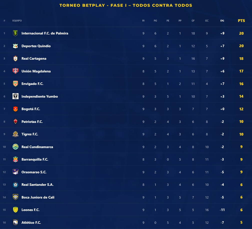 Como líder se mantiene Internacional de Palmira, que llega a 20 puntos con una diferencia de gol de +9. Sus perseguidores son Deportes Quindío, que suma los mismos 20 puntos, pero con una diferencia de +7; Real Cartagena con 18; Unión Magdalena con 17; Envigado con 16; Independiente Yumbo con 14; Bogotá FC con 12; y Patriotas con 10.