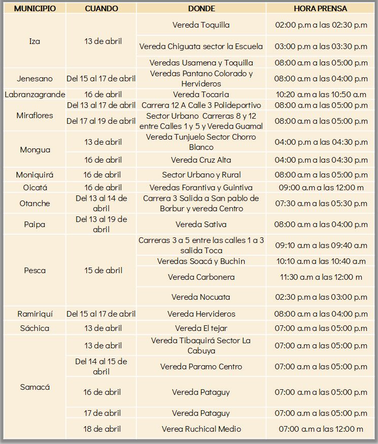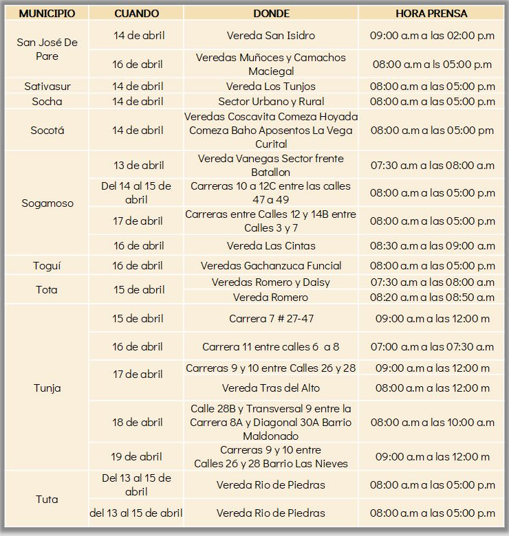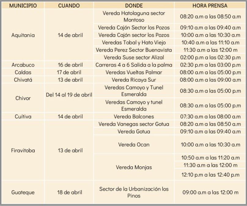 La Empresa de Energía de Boyacá (EBSA) anunció que del 13 al 19 de abril se realizarán cortes de luz en 29 municipios del departamento por mantenimientos en las redes eléctricas.