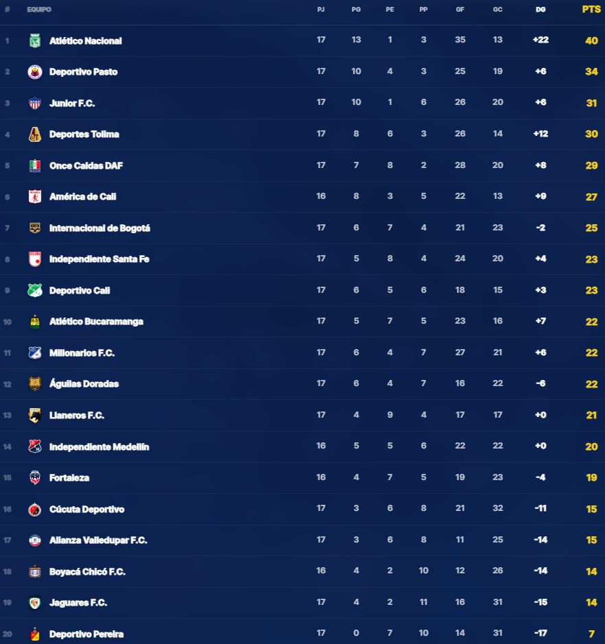 Nacional se mantiene como líder con 40 puntos, seis más que su inmediato perseguidor, Pasto. El grupo de los ocho lo completan Junior (31 unidades), Tolima (30), Once Caldas (29), América (27), Inter Bogotá (25) y Santa Fe (23).