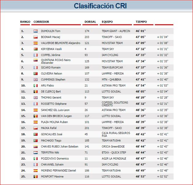 Pero Dumoulin no se conformó con la victoria del día, su registró le dio para descontar el 1’51” que cedía en la general y volverse a envestir la camiseta Roja como líder de la carrera, Majka, Aru y Rodríguez quedaron a la vera del camino del hombre del Giant rumbo a la cabeza de la competencia.